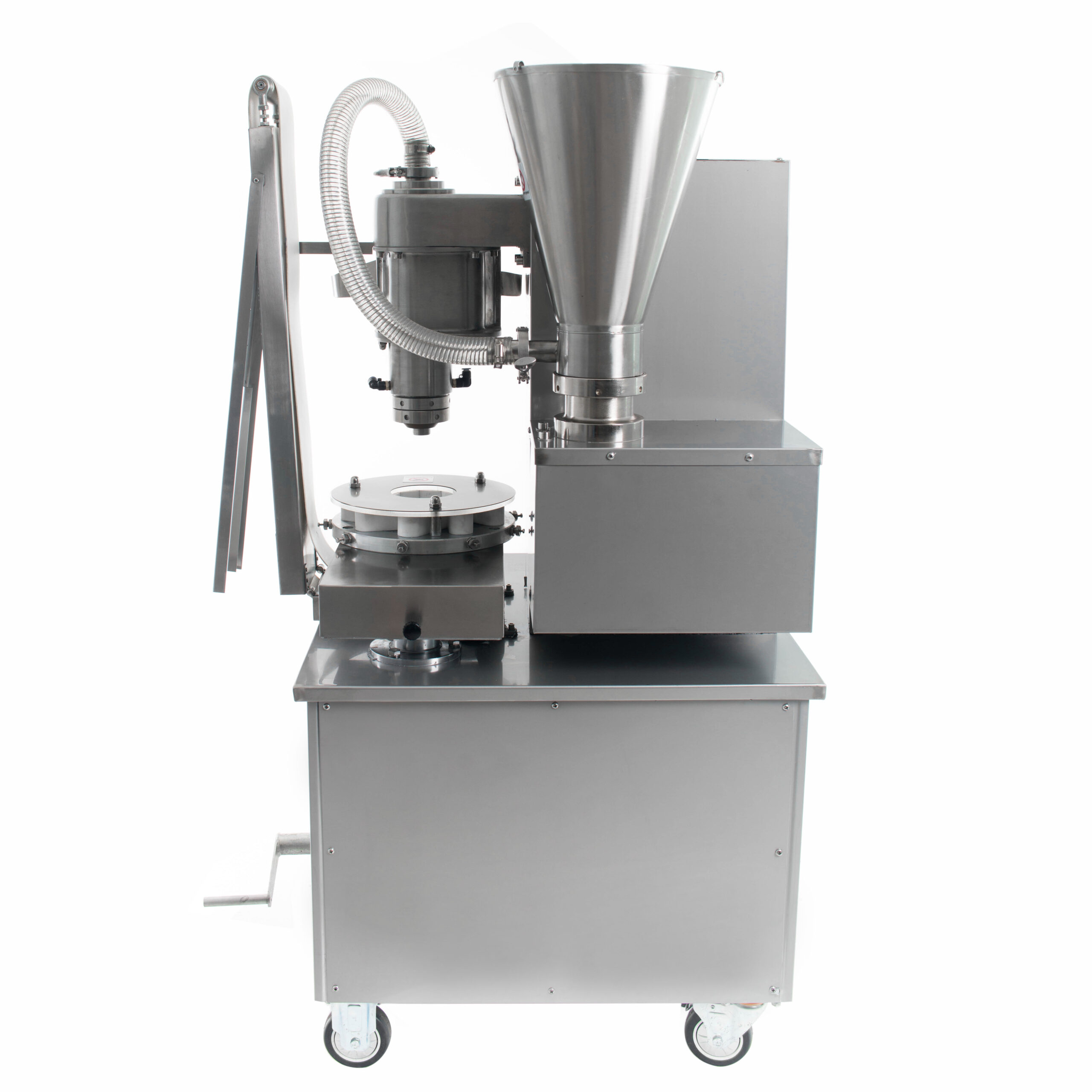 - Механический контроль подачи начинки и теста дает возможность регулировать объем используемого сырья в производстве хинкали.